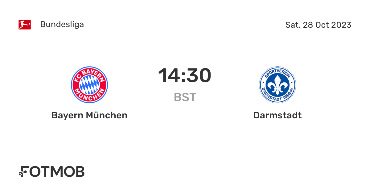 vs. FC Bayern München. live score, H2H results, standings and prediction. Darmstadt 98 is going head to head with FC Bayern München starting on 16 Mar 2024 at 14:30 UTC at Merck-Stadion am Böllenfalltor stadium, Darmstadt city, Germany. The match is a part of the Bundesliga. Darmstadt 98 played against FC Bayern München in 2 matches this.