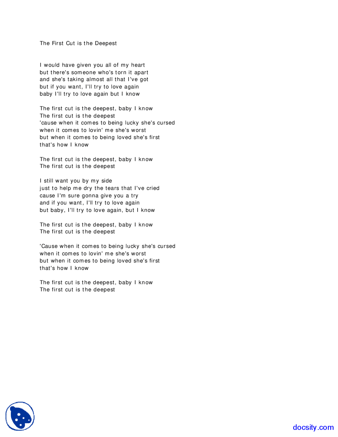 The first cut is the deepest, baby I know The first cut is the deepest 'Cause when it comes to bein' lucky, she's cursed When it comes to lovin' me, she's worse But when it comes to bein' loved, she's first That's how I know The first cut is the deepest, baby I know The first cut is the deepest I still want you by my side