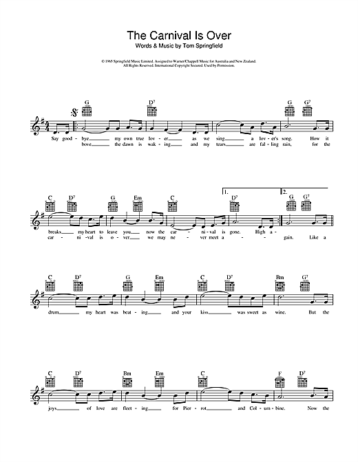The Seekers 'The Carnival Is Over' Sheet Music, Chords & Lyrics Download Printable Pop PDF