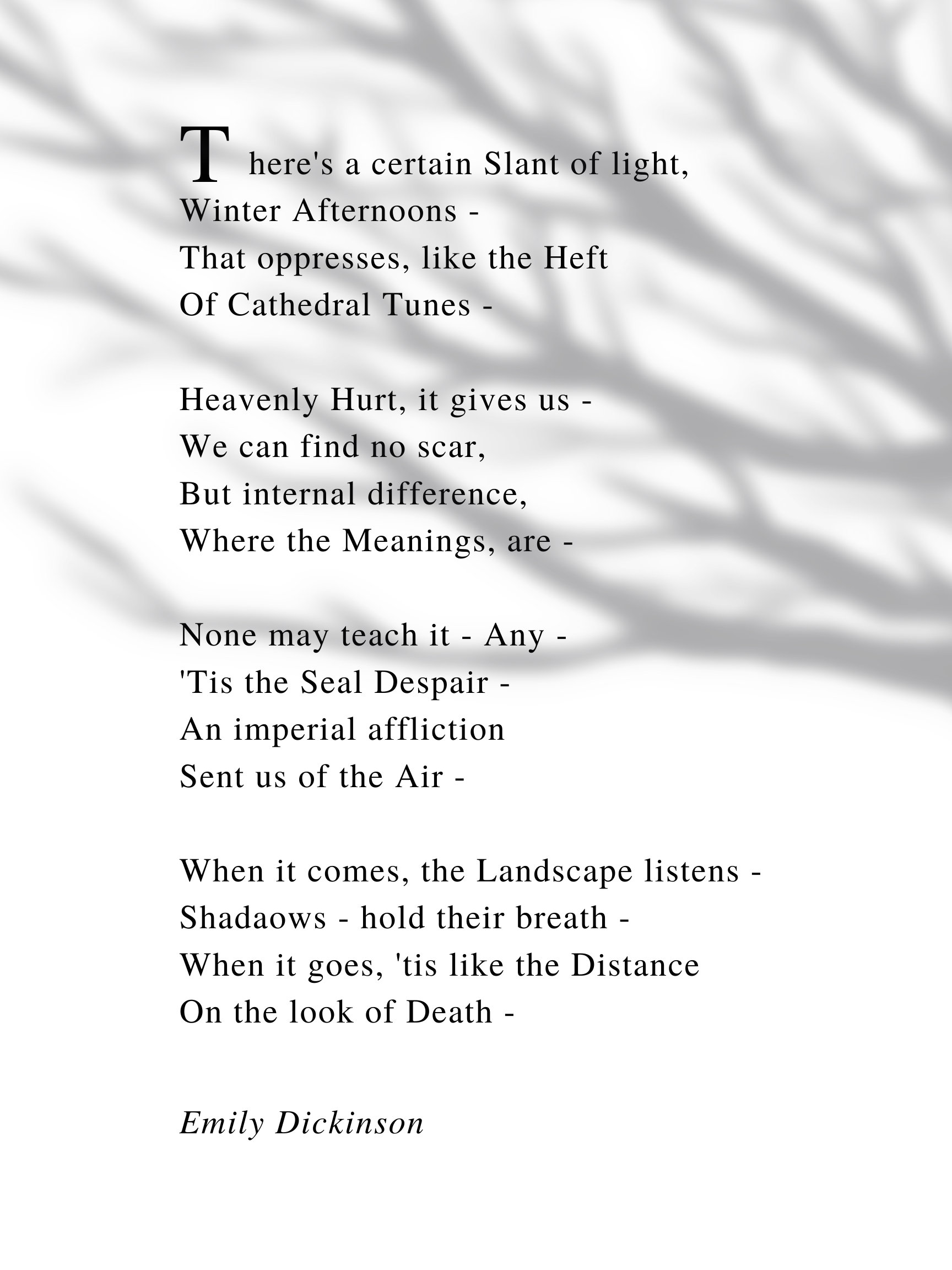 There's a certain Slant of light, Winter Afternoons - That oppresses, like the Heft Of Cathedral Tunes - Heavenly Hurt, it gives us - We can find no scar, But internal difference, Where the Meanings, are - None may teach it - Any - 'Tis the Seal Despair - An imperial affliction Sent us of the Air - When it comes, the Landscape listens - Shadows - hold their breath - When.